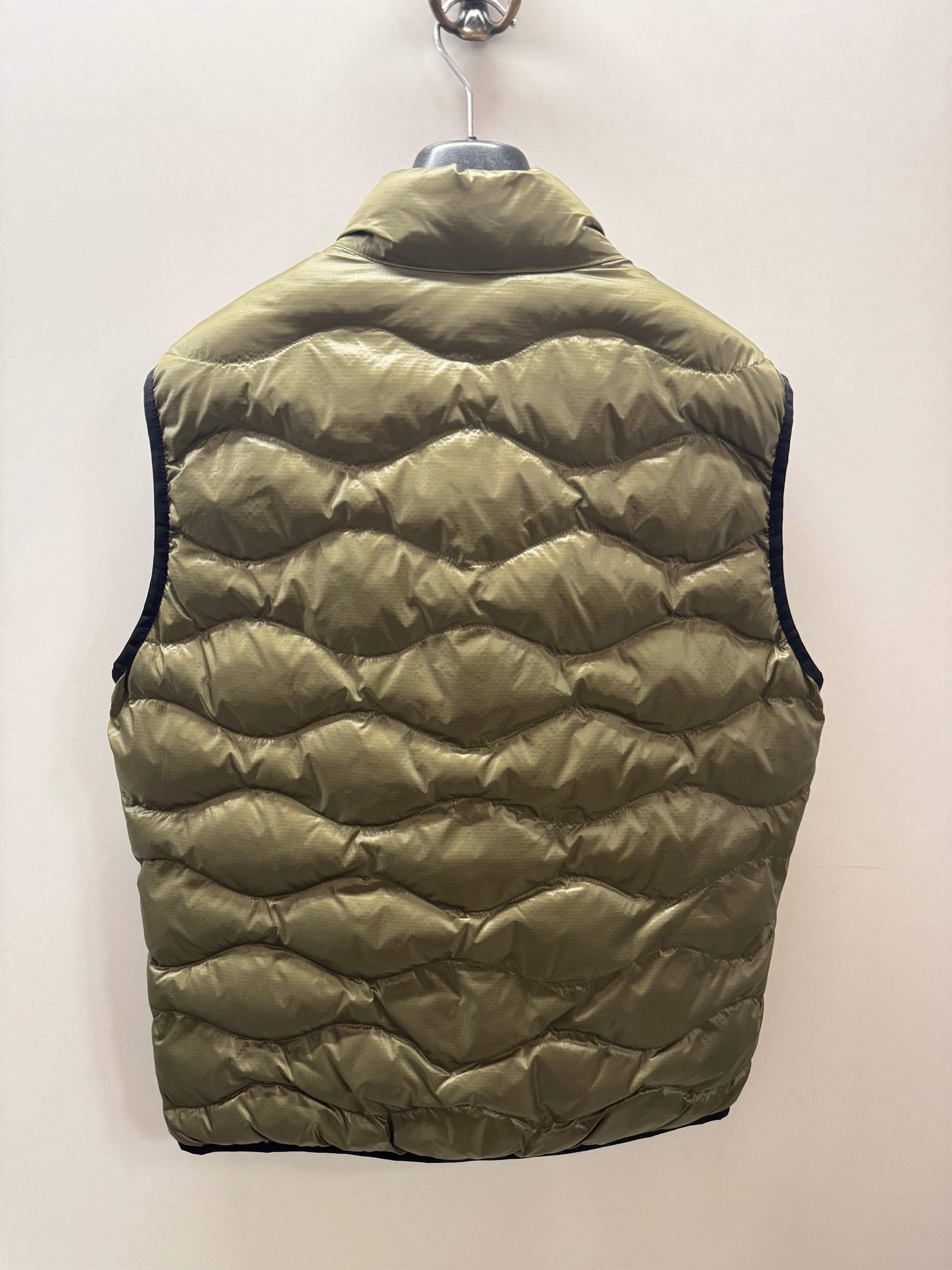 Giacchino smanicato in nylon, imbottito ovatta sostenibile. Profilo in lycra in tono sul fondo e nel giro maniche.
