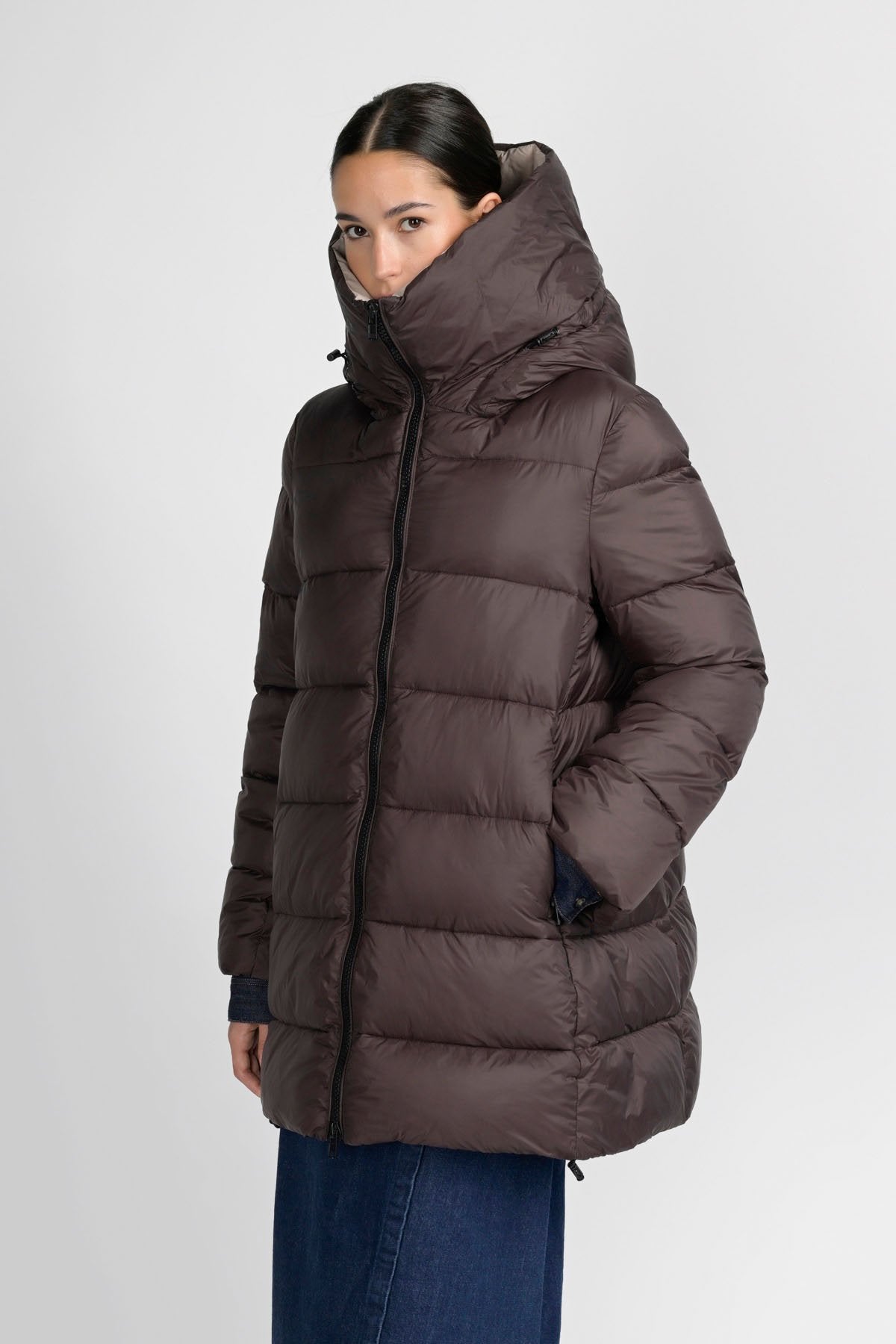 Volete stare al caldo, senza rinunciare all'eleganza? Questo piumino imbottito lungo fa sicuramente al caso vostro. I materiali che lo compongono: nylon al 100% per l'esterno e una fibra sintetica proveniente da materiali riciclati per l'interno, lo rendono super leggero, ma anche super caldo. Il cappuccio integrato imbottito e una coulisse sul fondo permettono di chiuderlo completamente, lasciando all'esterno vento e freddo. Perfetto per i weekend in montagna, abbinato ad outfit e accessori eleganti, non vi farà sfigurare nelle occasioni più formali.