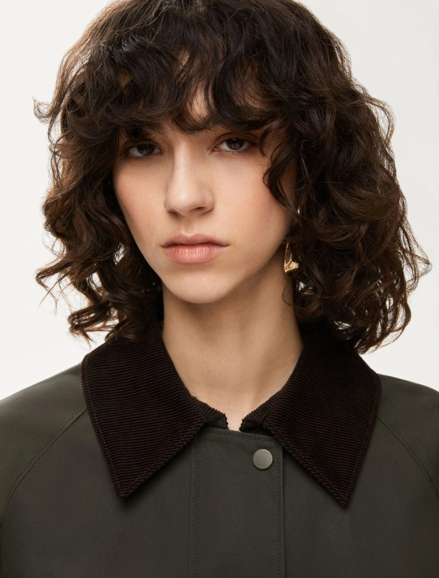 - Colletto e risvolto dei polsi in velluto a costine, contropiega centrale con cinturino e bottone, capo foderato