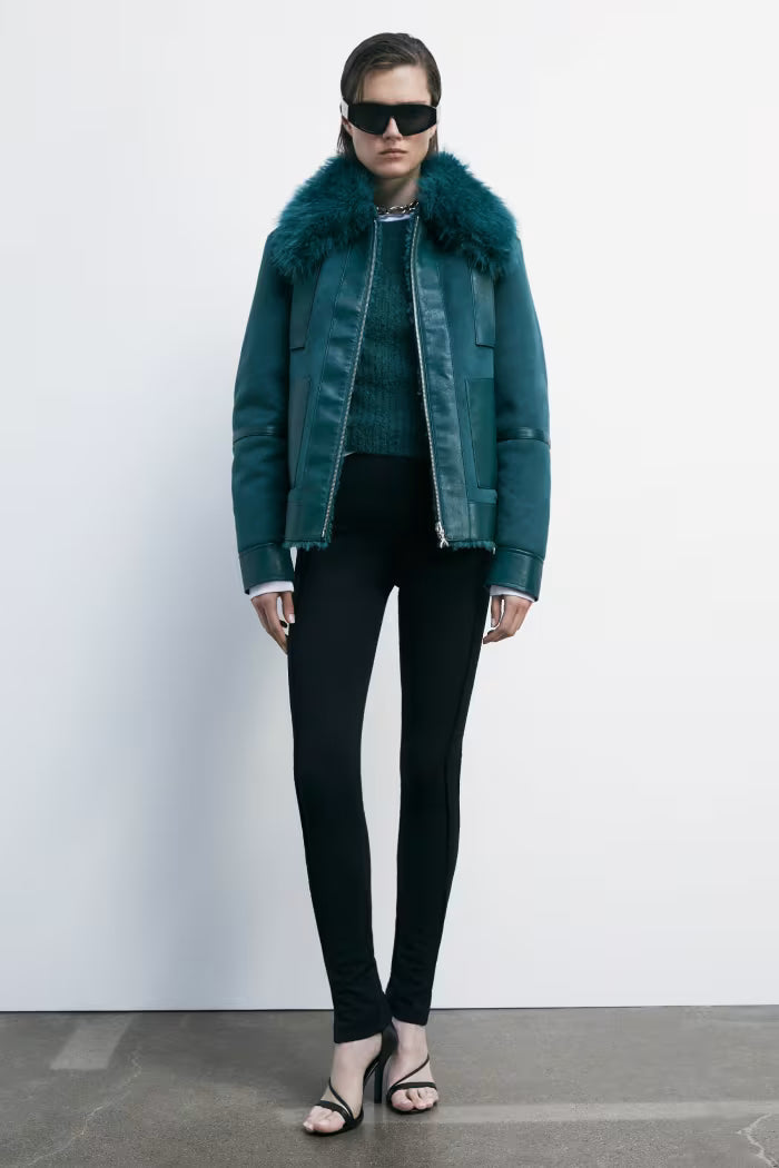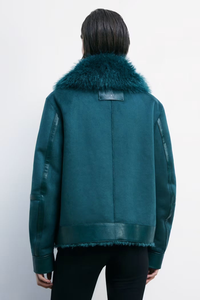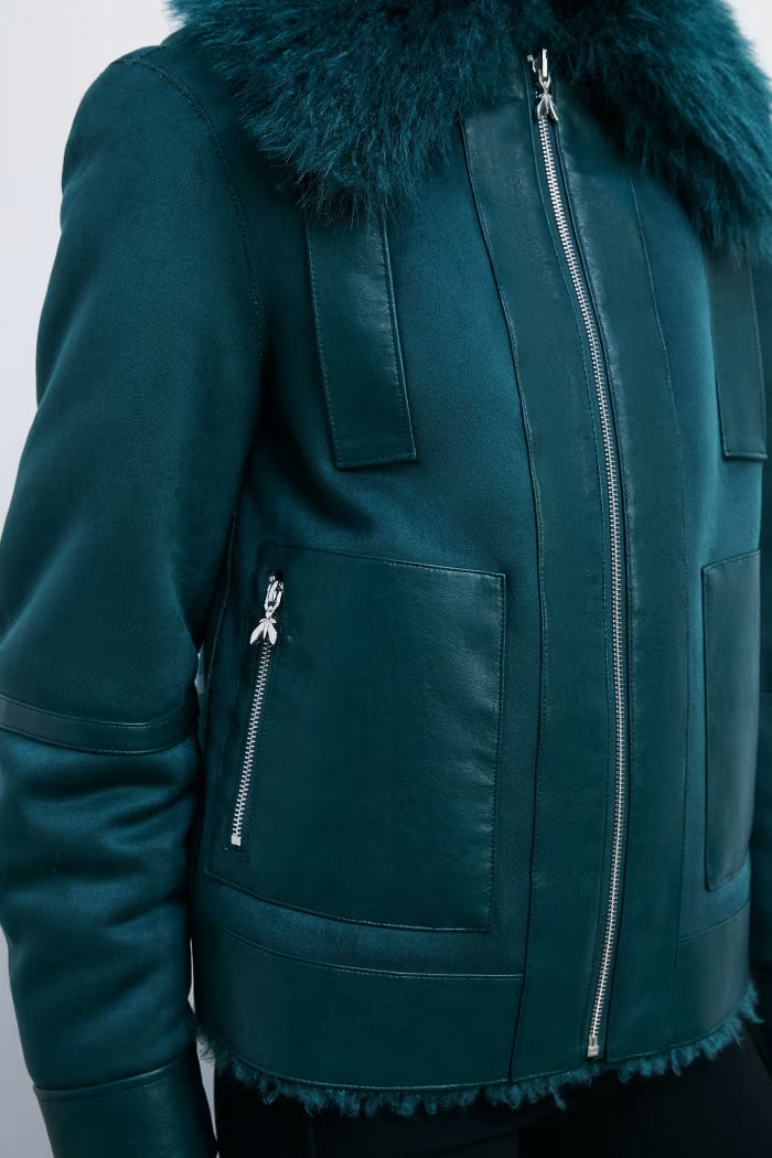 Giubbotto stile biker dal design reversibile con zip: da un lato è soffice con collo morbido e dettagli in tessuto spalmato che valorizzano maniche e busto. Girato, è un capospalla fluffy, avvolgente e voluminoso, con ampie tasche aperte. Sofisticato e funzionale, eleva look day to night.