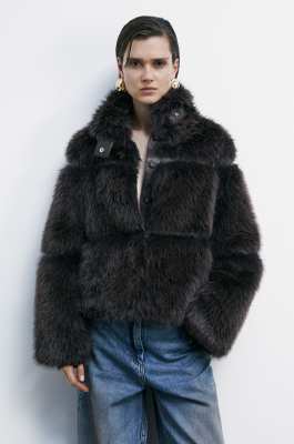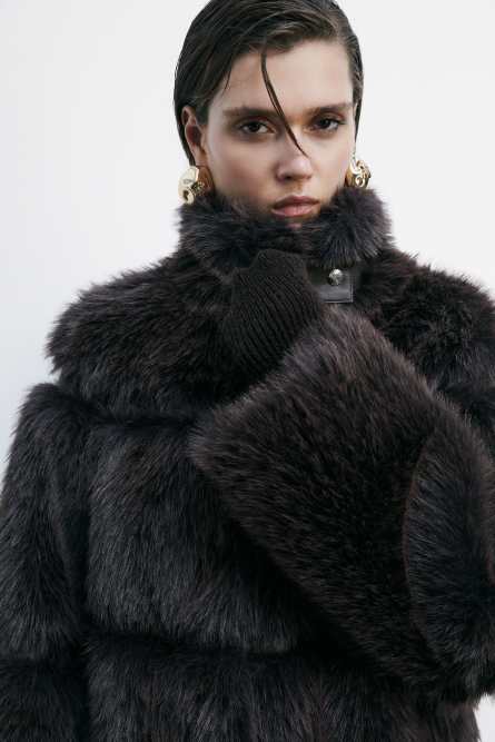 Cappotto fluffy corto con design a collo alto. I polsi in maglia assicurano calore, mentre gli inserti in tessuto spalmato definiscono le maniche e il profilo della chiusura a bottoni. Morbido e voluminoso, aggiunge carattere a look casual glam, perfetto con denim wide leg e stivali con tacco.