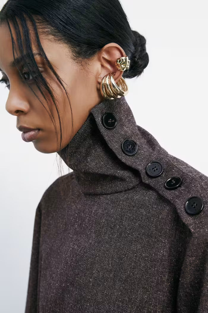 Maglia a collo alto in tessuto strutturato con effetto bottonato per una texture materica dall'appeal moderno. I bottoni apribili seguono il profilo del collo morbido e proseguono fino alla spalla come dettaglio decorativo. Indossala con gli shorts o i pantaloni palazzo abbinati e gli stivali Square per un total look glamour con twist rock.