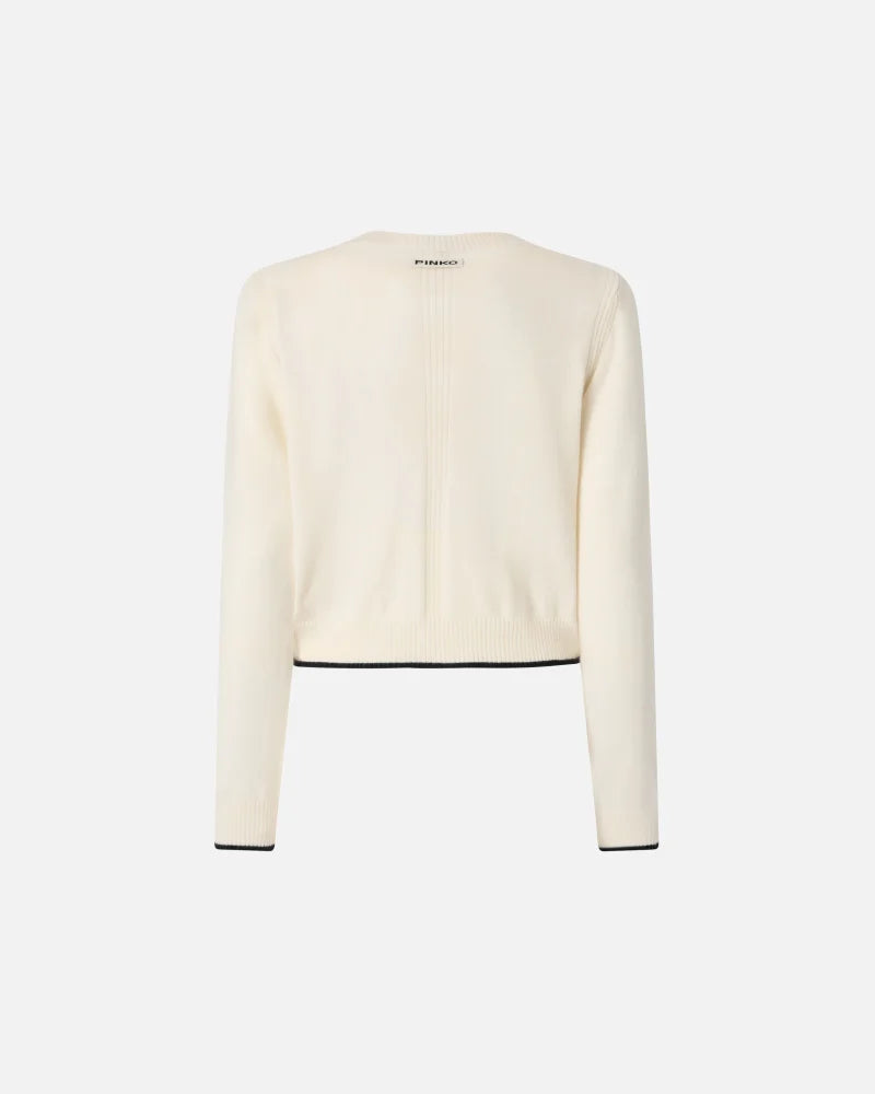 Cardigan realizzato in soffice misto di lana merino e cashmere con scollo a V, orlo e polsini lavorati a coste. Il filato a contrasto mette in risalto i polsini e l'orlo, mentre la caratteristica etichetta con logo lettering PINKO completa il design. Il capo è stato sottoposto a prove di finissaggio per ridurre al minimo la possibile formazione di pilling, garantendo una maggiore morbidezza e durabilità del tessuto. Essenziale e contemporaneo, questo design diventerà un vero e proprio passe-partout.