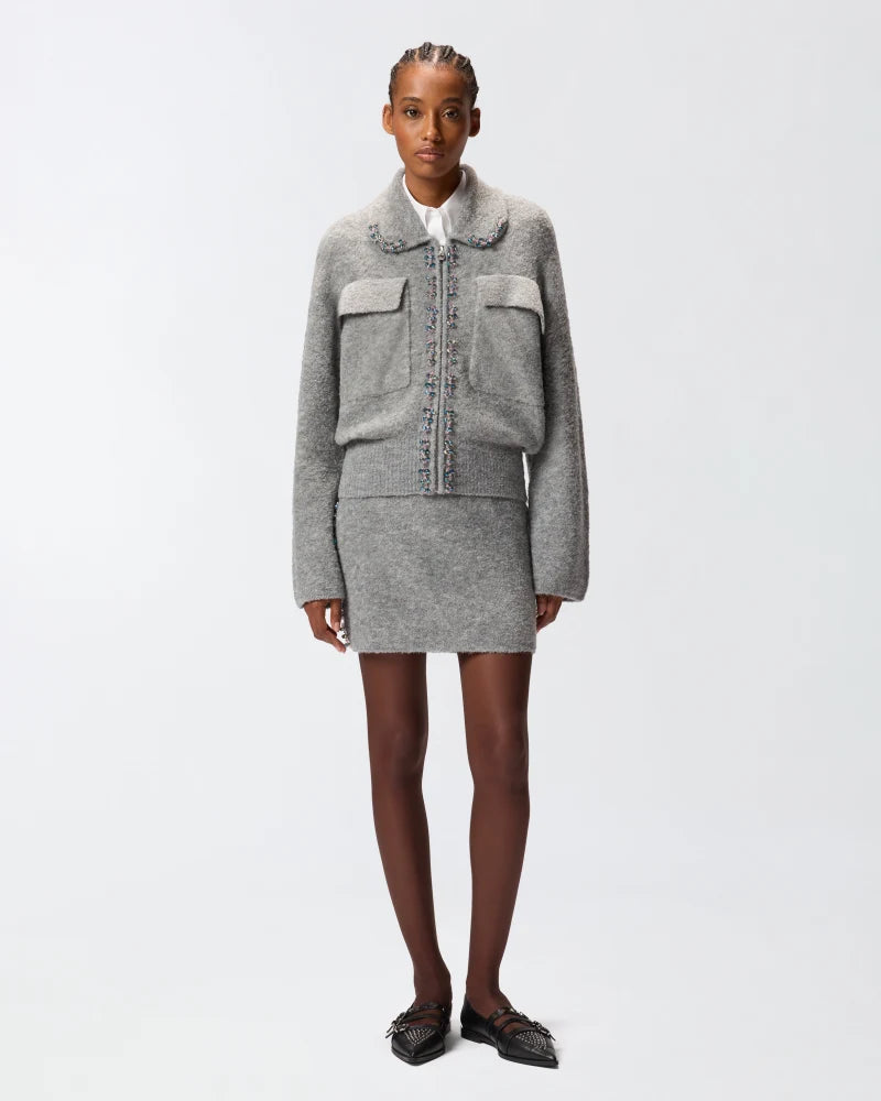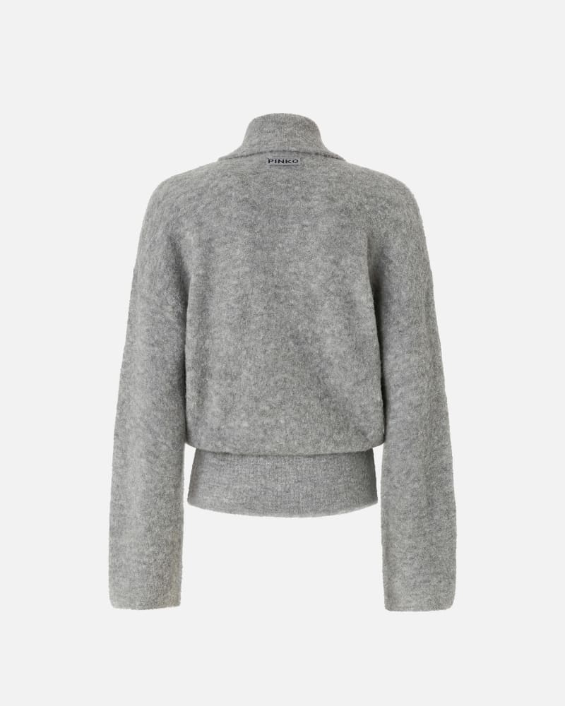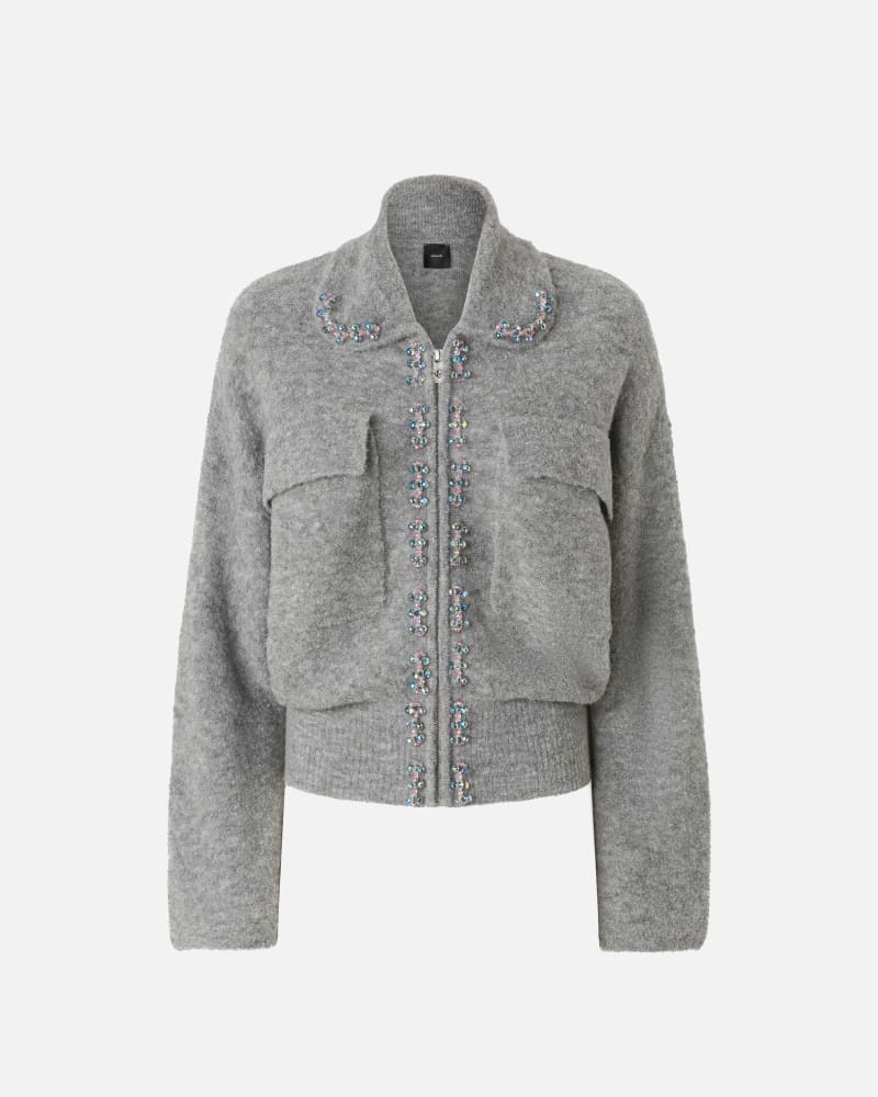 Giacca con colletto, tasche con patta sul petto e fascia elasticizzata al fondo, realizzata in morbida maglia di misto lana effetto bouclé. Il logo lettering PINKO tono su tono spicca sul retro, mentre i bordi del colletto con punte arrotondate e i lati della chiusura con zip sono delineati da colorate perline gioiello per illuminare il look e impreziosire il tessuto. Il capo è stato sottoposto a prove di finissaggio per ridurre al minimo la possibile formazione di pilling, garantendo una maggiore morbidezza e durabilità del tessuto.