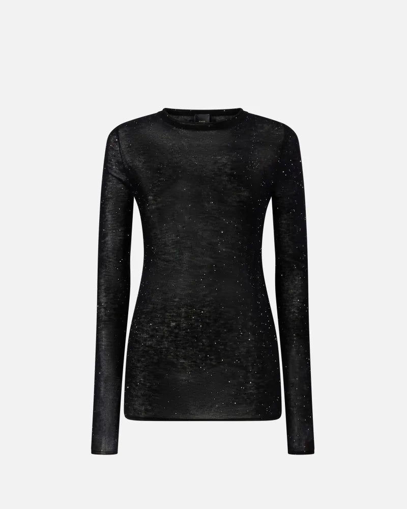 Maglia girocollo realizzata in misto lana semitrasparente: un filato leggero e morbido, quasi impalpabile, che contribuisce a creare un look sensuale e appariscente. Il design è impreziosito da micro paillettes inserite nel filo e riesce nell'impresa di risultare luminoso e al tempo stesso essenziale e molto comodo all'indosso. Il capo è stato sottoposto a prove di finissaggio per ridurre al minimo la possibile formazione di pilling, garantendo una maggiore morbidezza e durabilità del tessuto. Il tocco finale è dato dall'etichetta con logo lettering PINKO sul retro.
