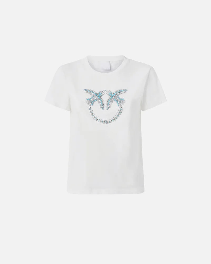 T-shirt a maniche corte in jersey di cotone. Il capo è impreziosito dal logo Love Birds decorato da un ricamo realizzato a mano composto di perle, catenina di cristalli con taglio baguette e strass di diversa forma fissati con apposite alette laterali per renderli più saldi. Questa maglietta è perfetta da indossare in qualunque occasione, dalle più formali alle più sporty, per un tocco femminile e iconico.
