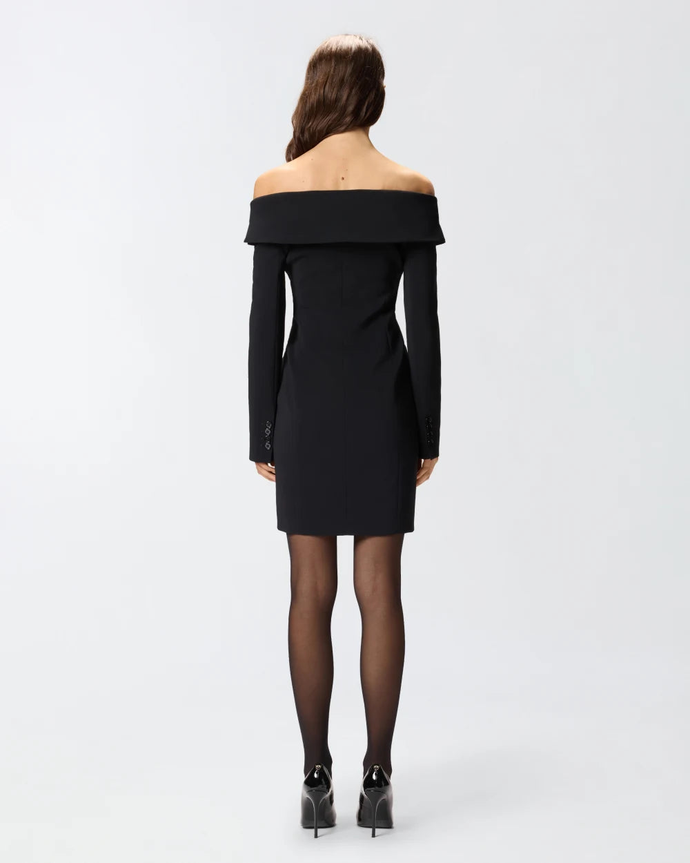 Vestito corto aderente a maniche lunghe realizzato in tessuto crêpe stretch che sottolinea la figura. L'abbottonatura decentrata, i polsini con bottoni e le tasche laterali a filetto sono un chiaro rimando al design di un classico blazer, mentre lo scollo ampio che lascia le spalle scoperte rende il modello decisamente femminile: l'effetto finale è un look strutturato ma di classe, come solo PINKO sa fare.