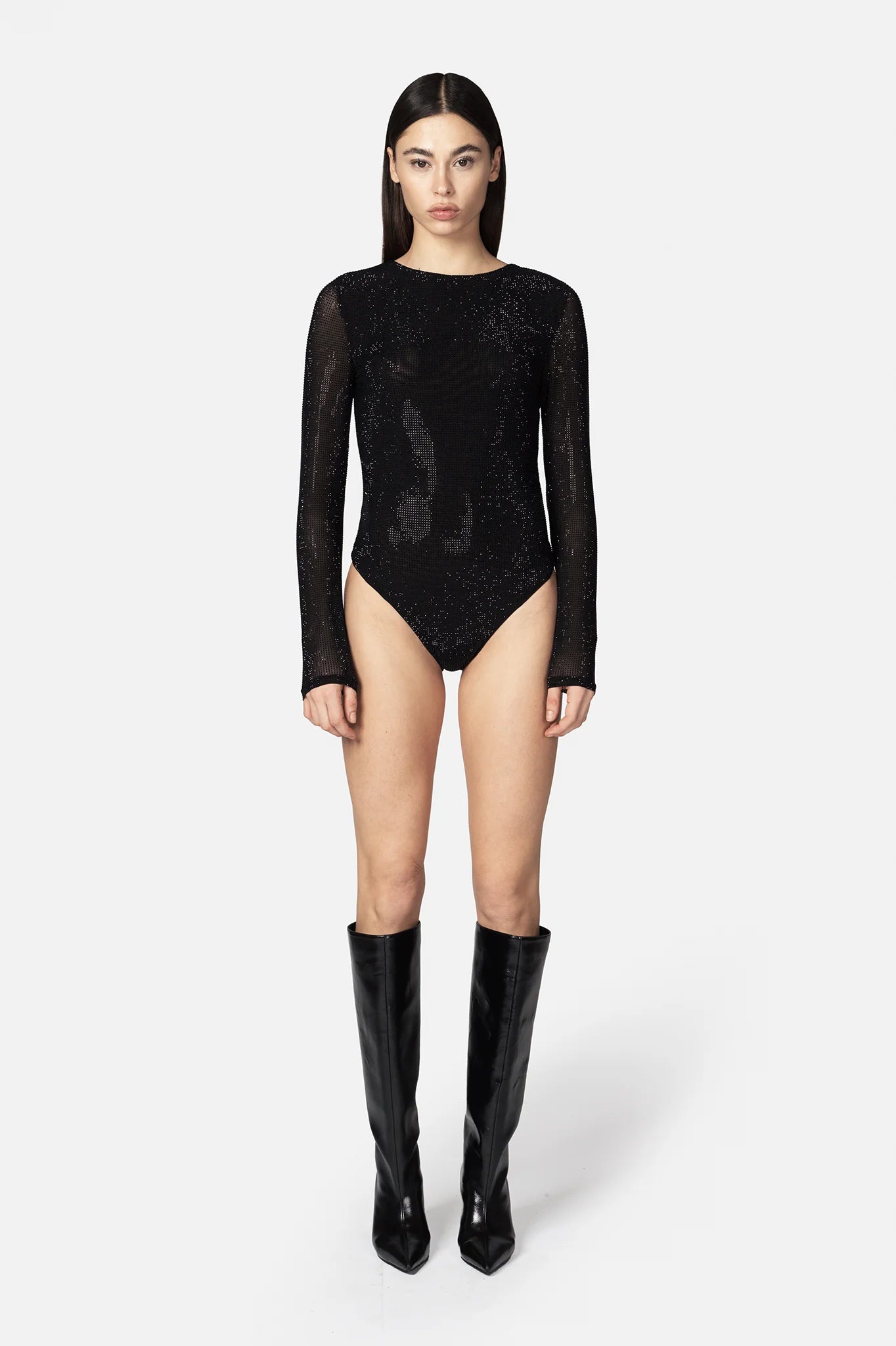 Body nero aderente in tulle stretch interamente ricoperto di strass, per una brillantezza sofisticata e una vestibilità che valorizza la silhouette. Presenta scollo tondo, chiusura con abbottonatura classica e maniche a guanto che amplificano l’effetto scenico del capo.